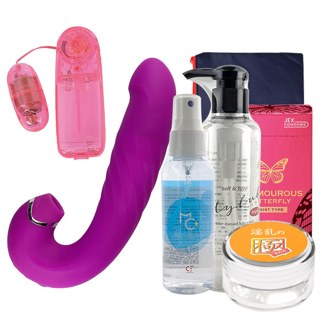 バイブやディルドと一緒に買えばすぐに使える「コンドーム、ローション、クリーナー、ローション専用拭き取りシート」の四点セットを販売中です。